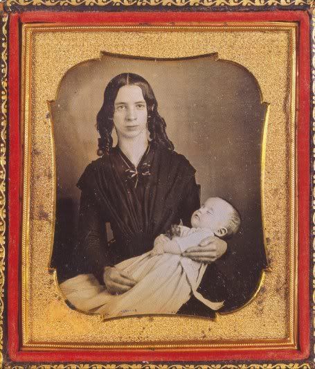 Child mortality rates were astronomical in the 19th century. For many grieving parents, taking a photograph of the dead child was a way to keep the child's memory alive. The image, like the one above, provided great comfort. A quick web search will turn up hundreds of daguerreotypes like this. An older child might be photographed on a sofa, surrounded by favorite toys. I've seen pictures where the deceased child was propped in a chair and dutifully surrounded by his surviving siblings.